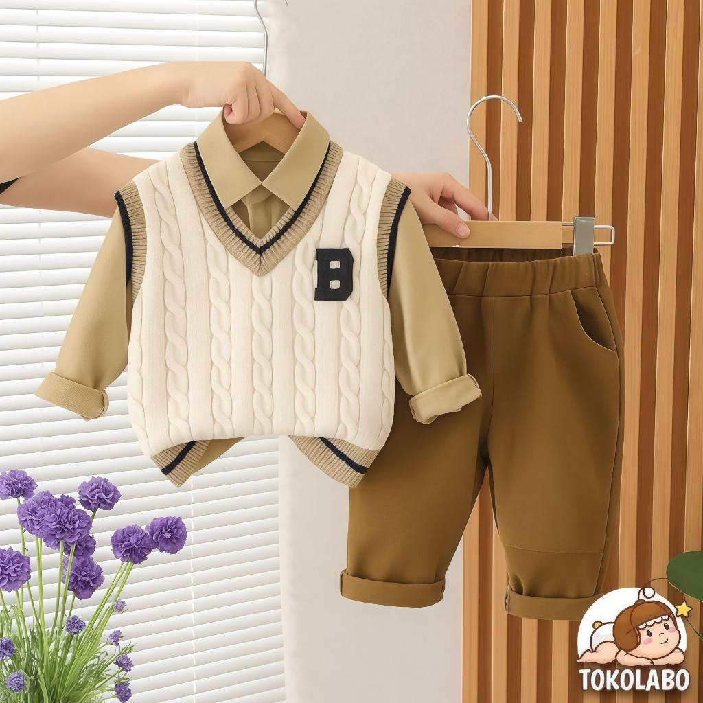 Tokolabo - Setelan Anak Laki-laki Fashion Korea Motif B 1-5 Tahun Kemeja Rompi Rajut Dan Celana Panjang
