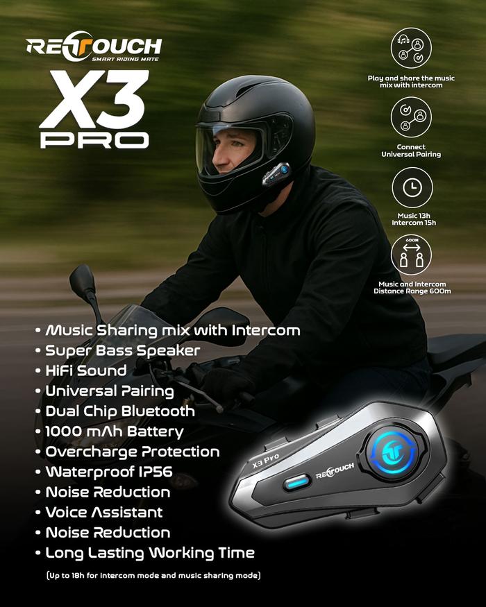 RETOUCH X3 PRO Intercom Bluetooth Helmet Call Music Sharing + Intercom Waterproof IP56 Tahan Air