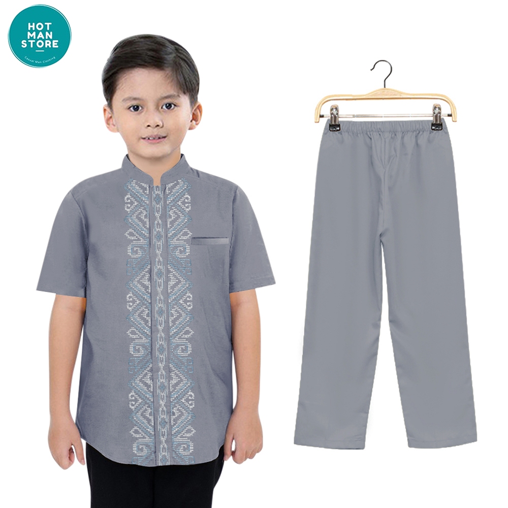 Hotman Setelan Baju Koko Kemeja Muslim Anak Laki-Laki Lengan Pendek Kombinasi Bordir Batik Premium 4-10 Tahun Terlaris D