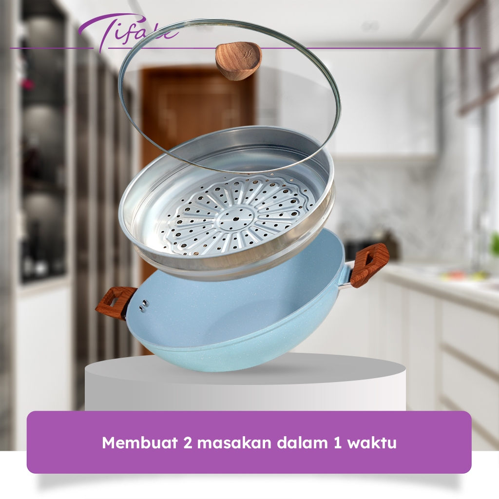Tifale [2IN1] Wokpan Diameter 32cm + Glass Lid + Granite Steamer Non Stick / Alat Masak Wok dengan Panci Kukus Granite A