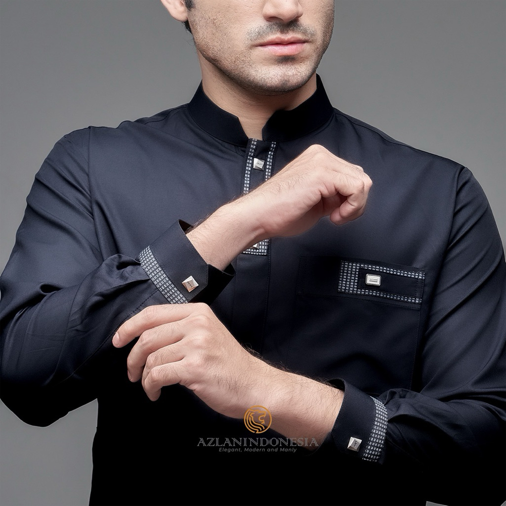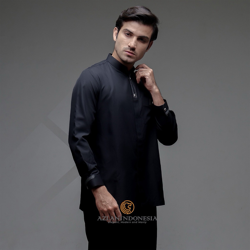 Azlan Indonesia - Kemeja Koko Pria Shaheen Full Sleeve Hitam | Fashion Muslim Pria Kemeja Koko Hitam Lengan Panjang AZ11
