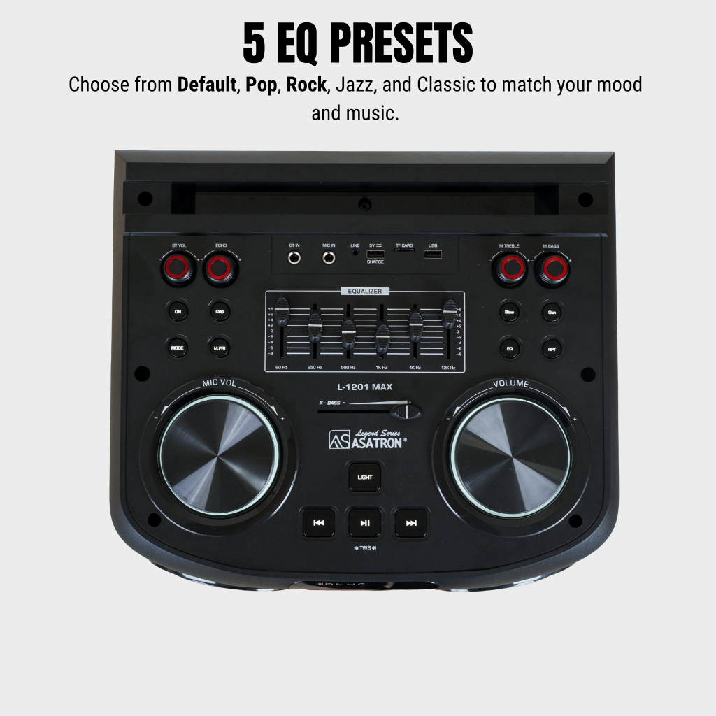 Asatron Legend L-1201 MAX Bluetooth Tower Party Speaker, Deep Bass, 2 UHF Wireless Mics
