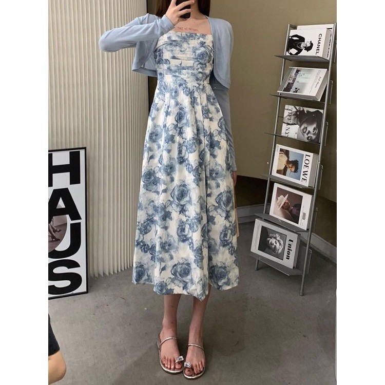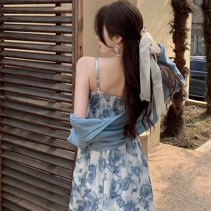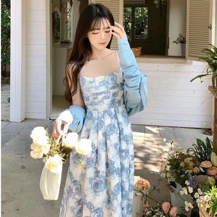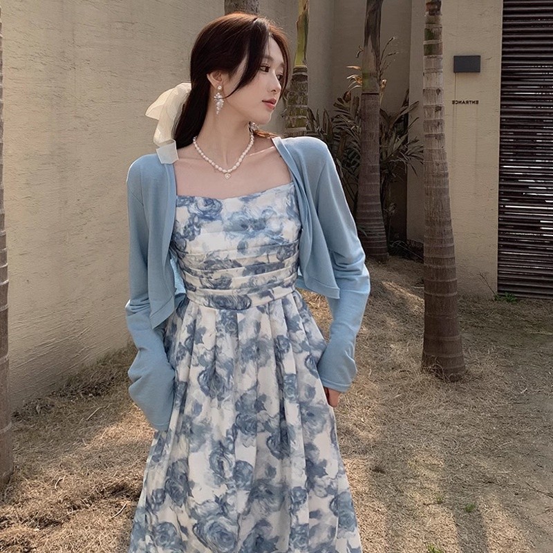 Sky Blue Rose Floral Midi Dress WITH Cardigan - Dress Casual Kasual Dress Import Impor Dress Bunga Daisy Biru Putih Dress Kardigan Dress Pantai Holiday Summer Dress