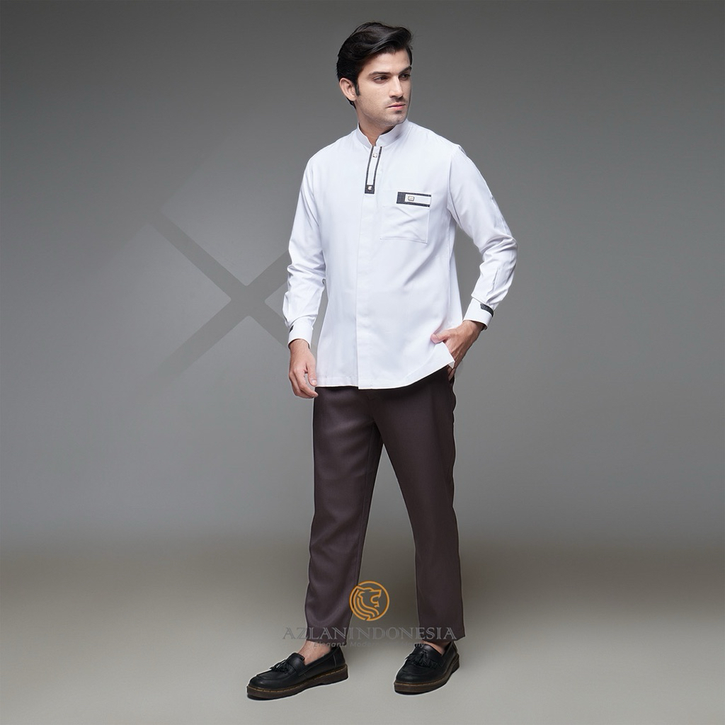 Azlan Indonesia - Kemeja Koko Pria Shaheen Full Sleeve Putih | Fashion Muslim Pria Kemeja Koko Putih Pria Lengan Panjang