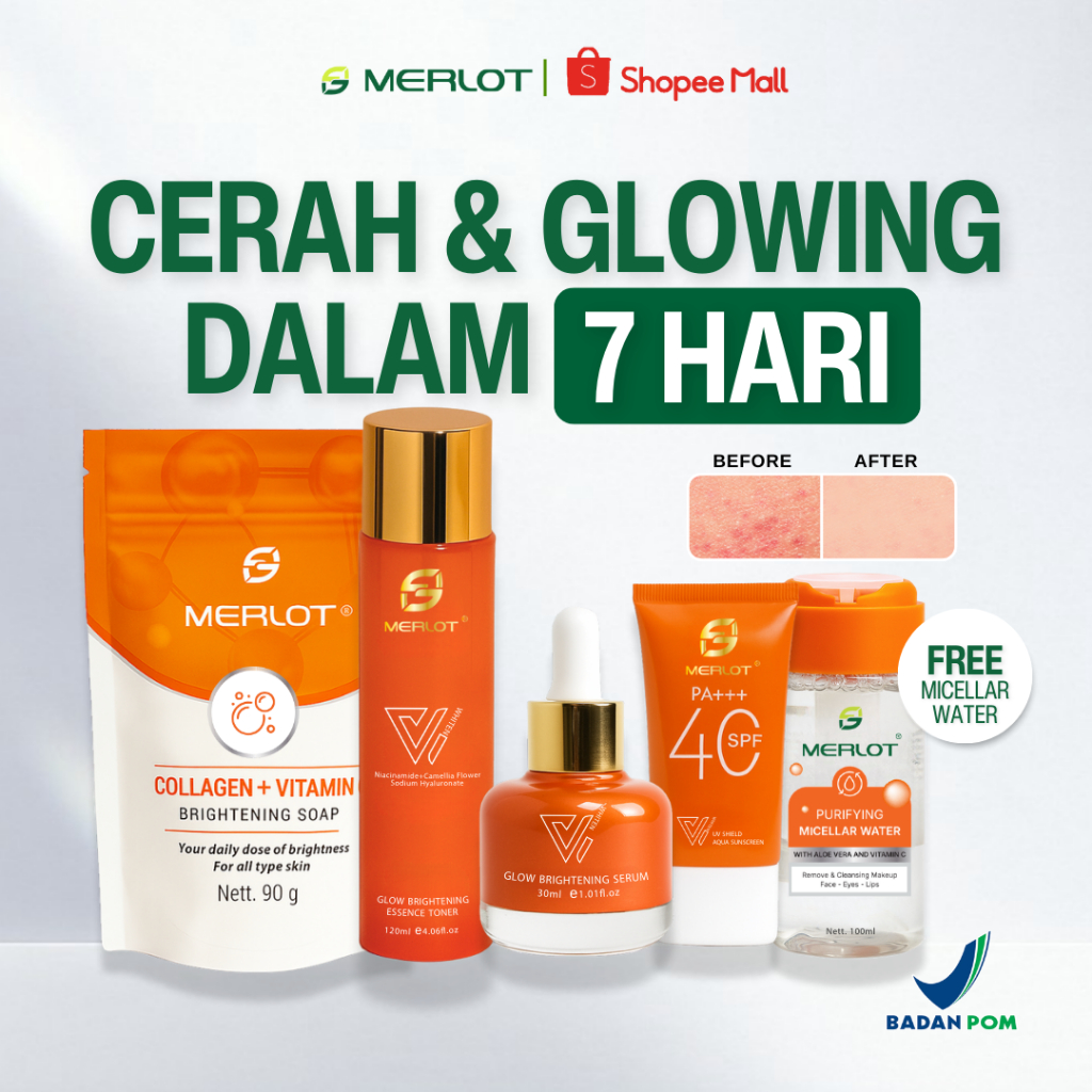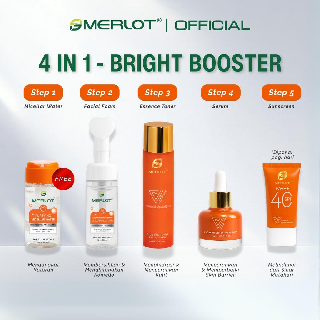 [GRATIS MICELLAR WATER] MERLOT Paket 4 in 1 Skincare Bright Booster - Sabun Brightening Whitening, Toner & Serum, UV Shi