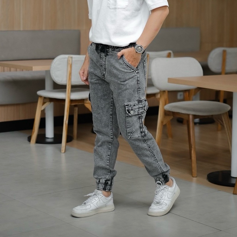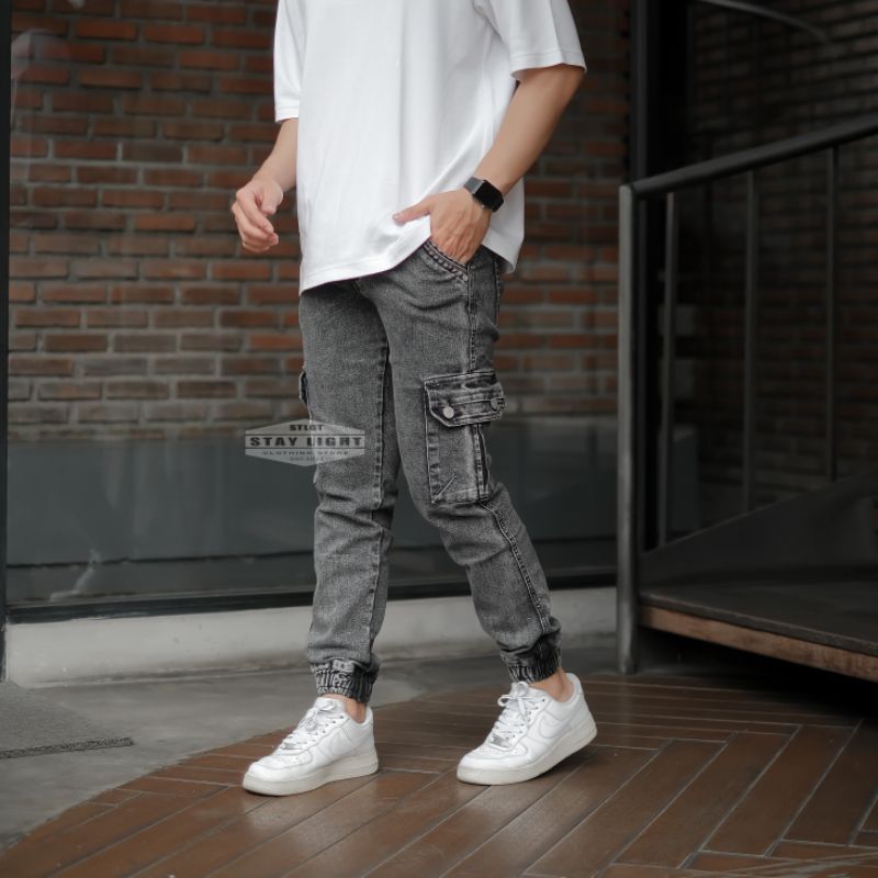 Staylight Celana jogger pria jeans cargo panjang / celana denim pria snow model cargo kerut