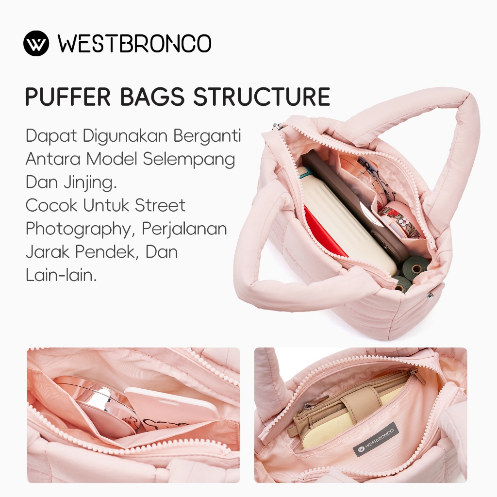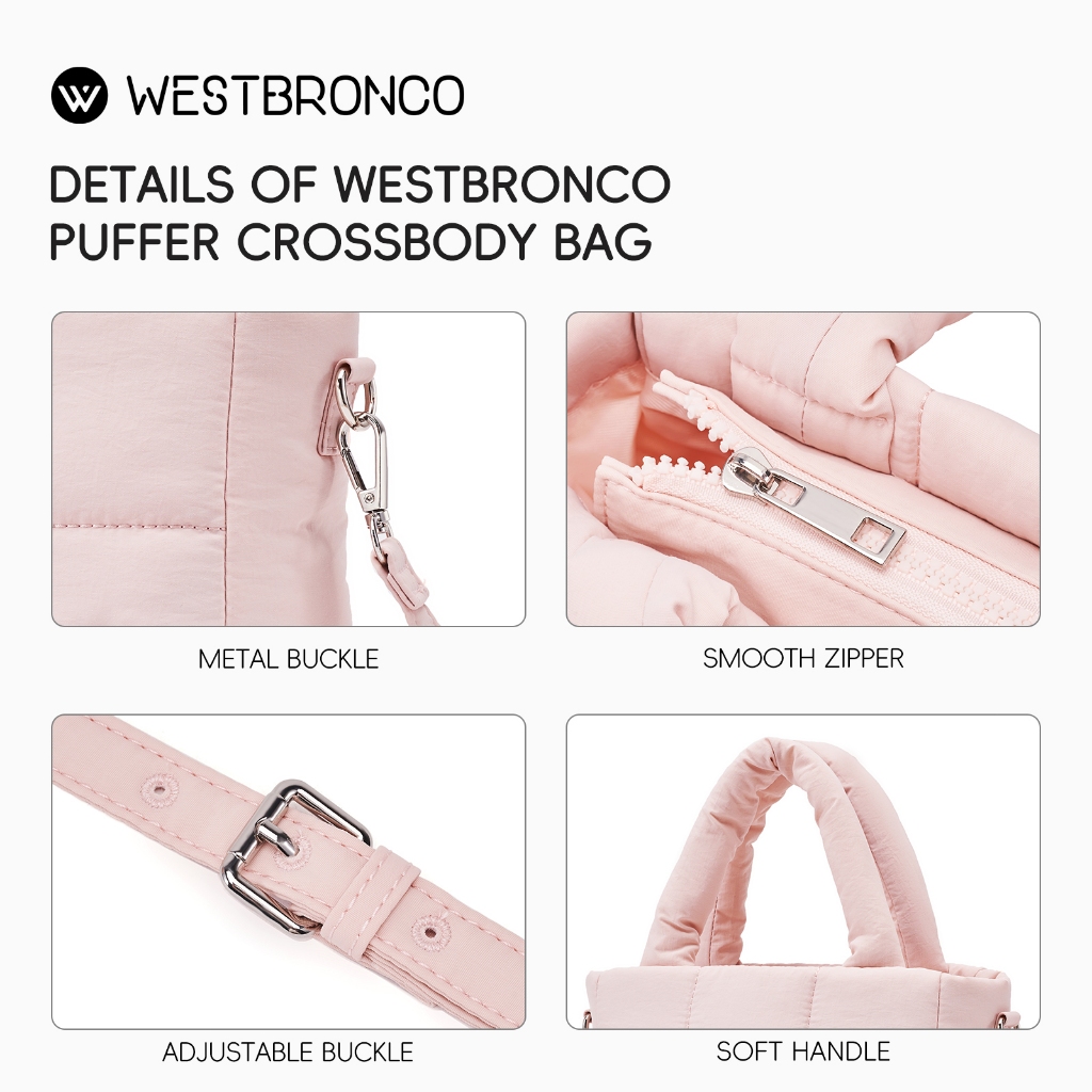 Westbronco [PUFFER CHERIE BAG] Tas nilon, Pegangan empuk, Risleting lancar, Saku di dalam, Tali bahu yang dapat dilepas, Tahan air, Tas selempang kecil