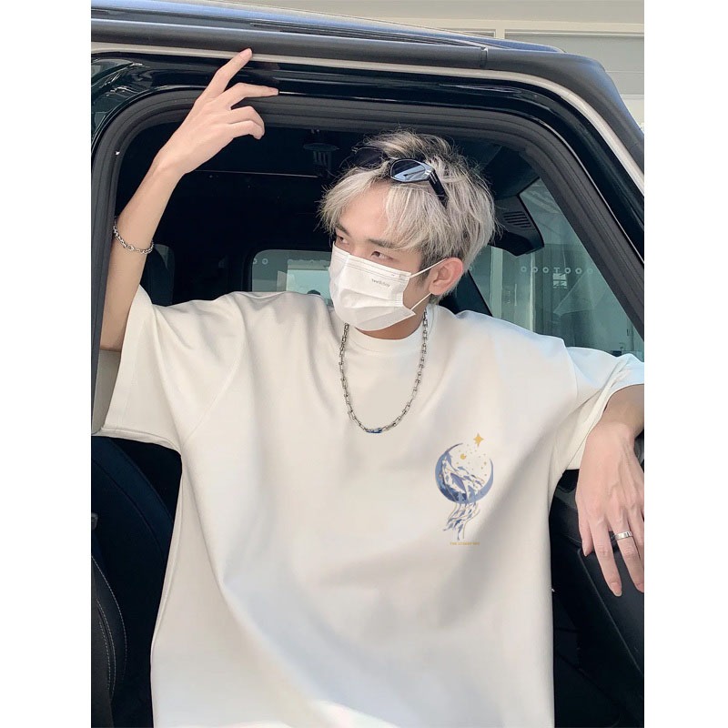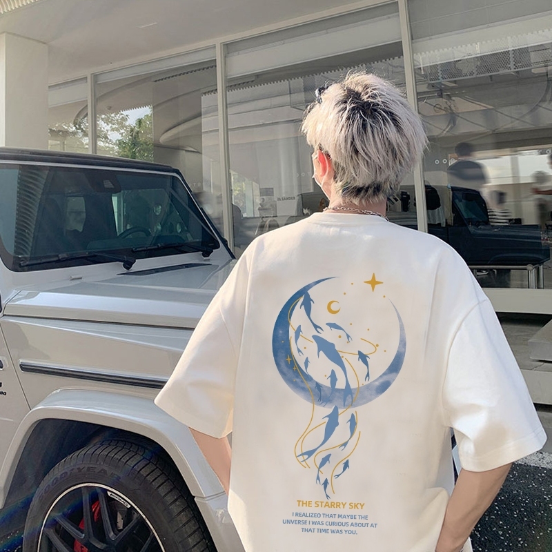 AUZY Kaos T-shirt Pria Oversize Cartoon Moon Dolphin Kaos Pria Distro Original 00 PERSEN Premium Longgar Street Style Kaos Putih/Baju Kaos Oversize Pria Keren/Kaos Pria The Starry Sky