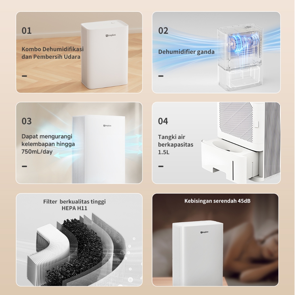 Simplus 2 IN 1 Dehumidifier dan Pembersih Udara 750ml/hari 1,5L Filter Hepa H11 Kualitas Tinggi