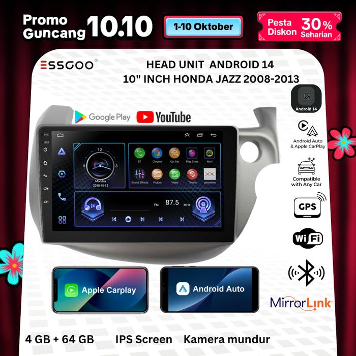 [Star]ESSGOO Head Unit 4G+64G Android 14 Untuk Honda Jazz 2008 - 2013 Termasuk Frame/PNP Soket 10 Inch - 10"2+32+Frame+P
