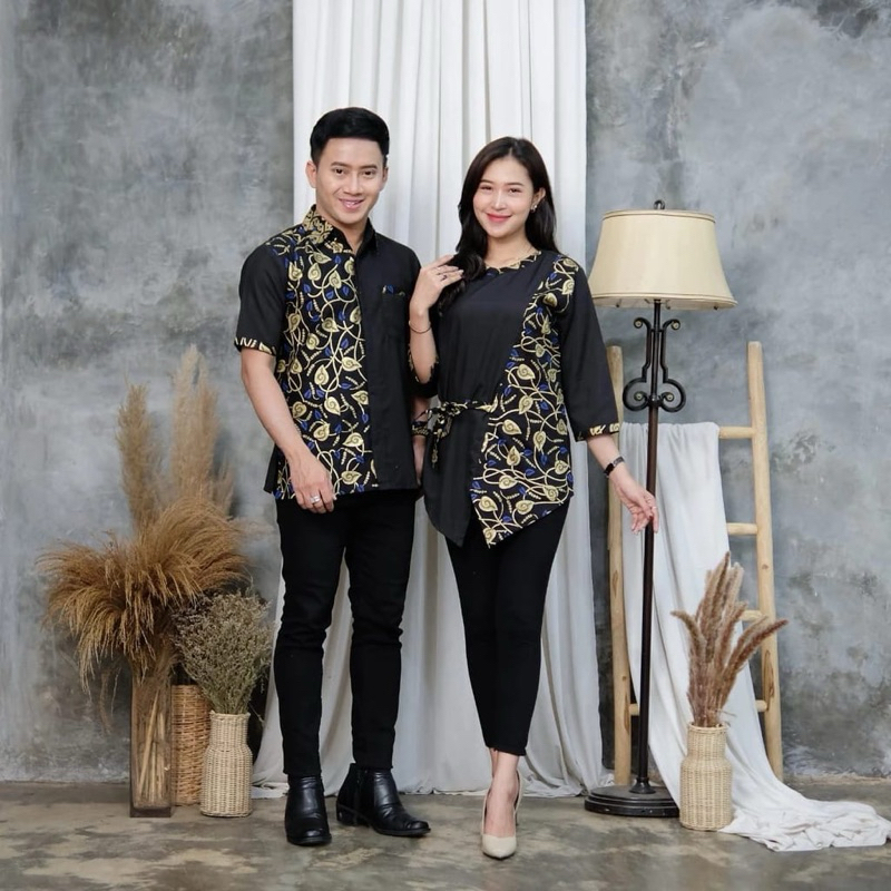 [Star] Couple kemeja dan bluse motif polos kombinasi batik kekinian fashion