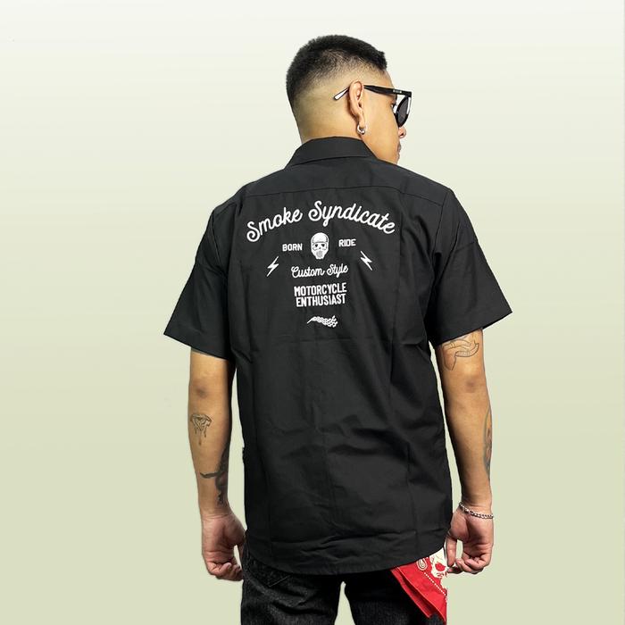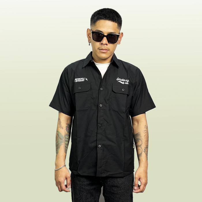 SMOKE Workshirt Kemeja 'SKULL' Black nyaman casual pria hitam slim fit motor outdoor casual Kerah