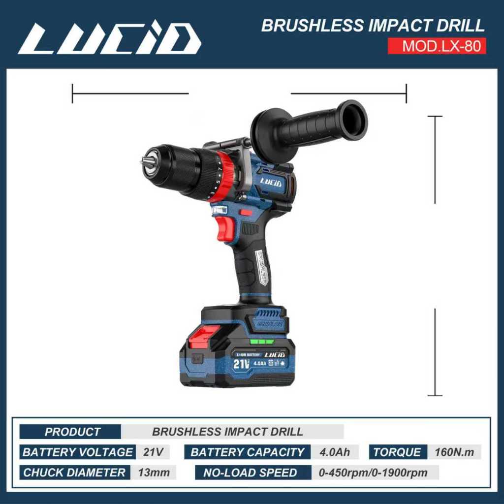 LUCID LX-80 Brushless Mesin Bor 13MM 4.0A 21V EVE 20P A-Class Lithium Battery 160NM Bor Listrik Impact Cordless Drill A