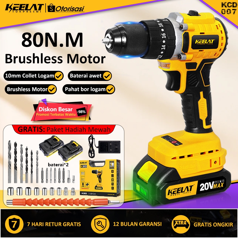 【KEELAT-KCD007】80N.M Bor Cordless Mesin Bor Listrik Brushless impact 2baterai cas 10mm Beton dinding Kayu besi tembok Bo