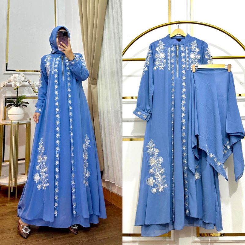 Gamis Bordir Set Hijab Terbaru bahan ceruty baby doll lebaran kekinian gamis kondangan terkini