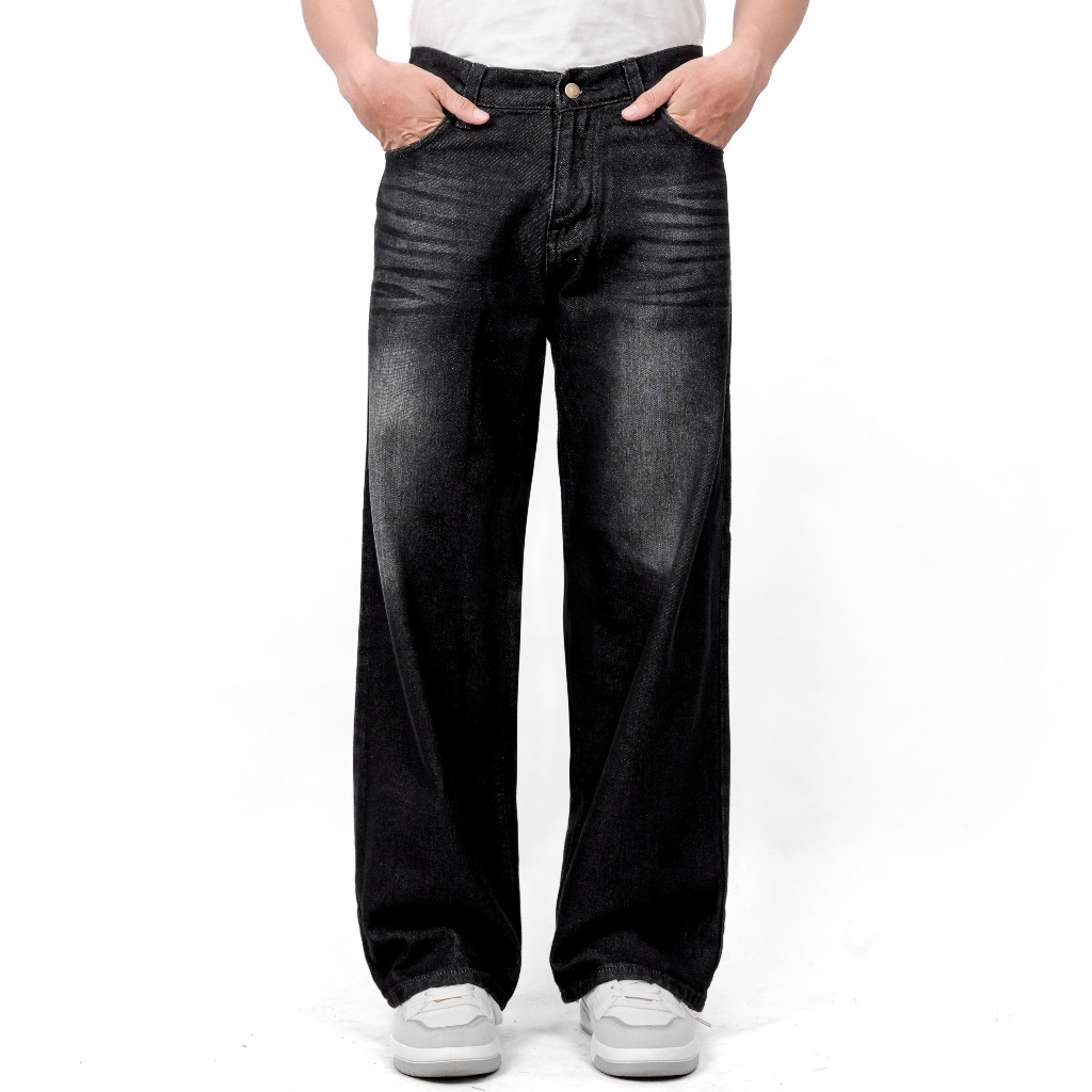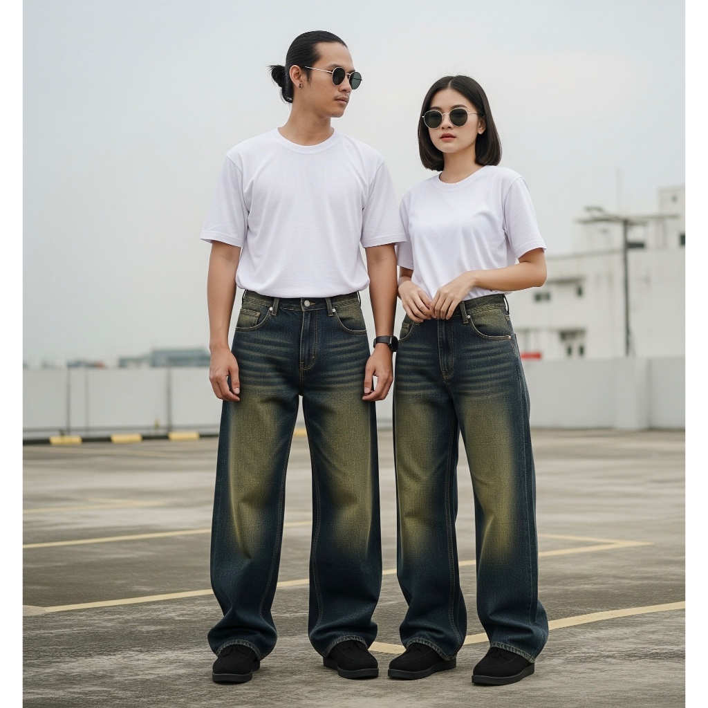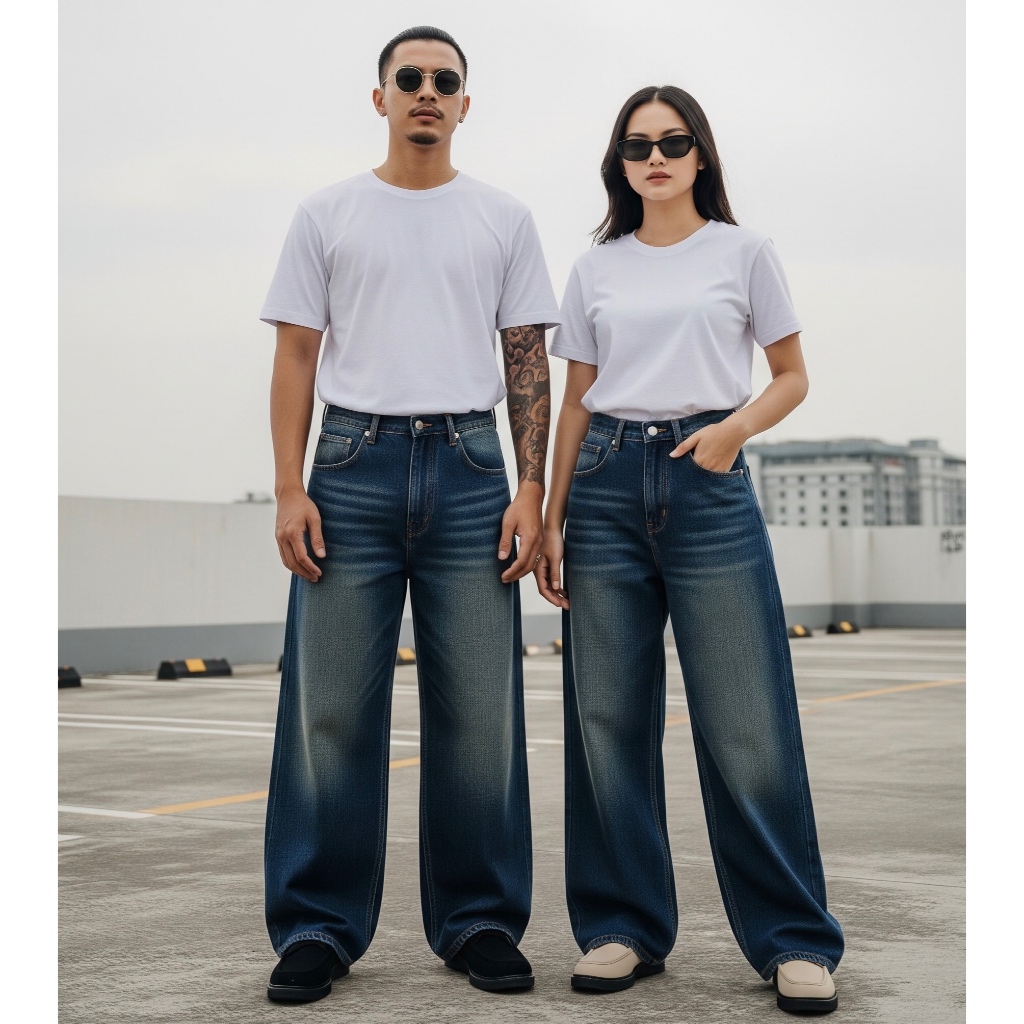 Celana Jeans Wide Leg Wisker Lebar Gombrong Skena Baggy Wisker Pria Wanita Unisex Loose Fit Denim