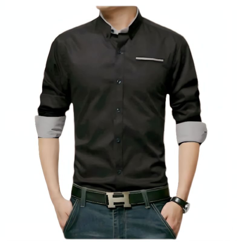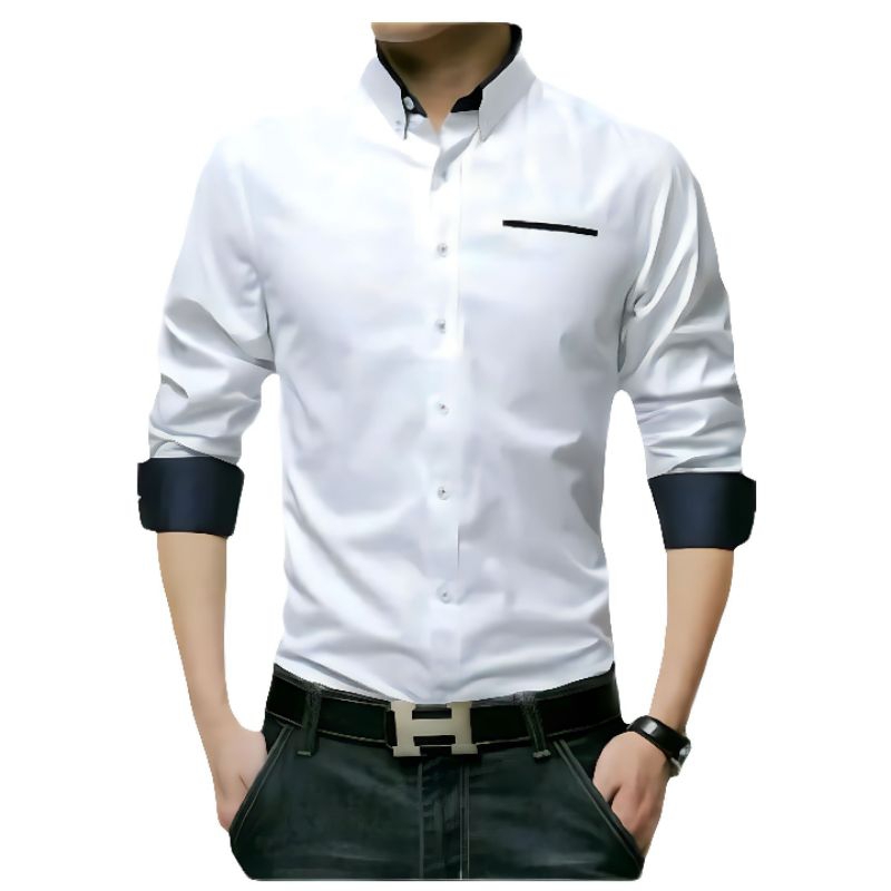 KEMEJA PRIA POLOS KOMBINASI SLIMFIT CASUAL LENGAN PANJANG PUTIH HITAM ABU MUDA NEVY BISA KATUN Adem Nyaman