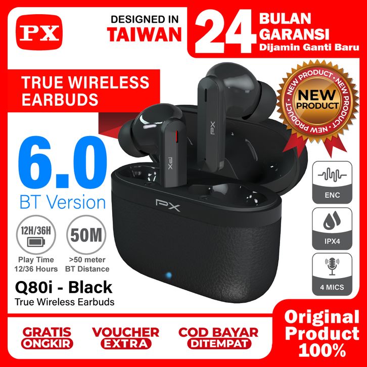 Headset TWS Earphone Bluetooth 6.0 Earbuds Headphone True Wireless ENC 4 Mics IPX4 PX Q80i - Black
