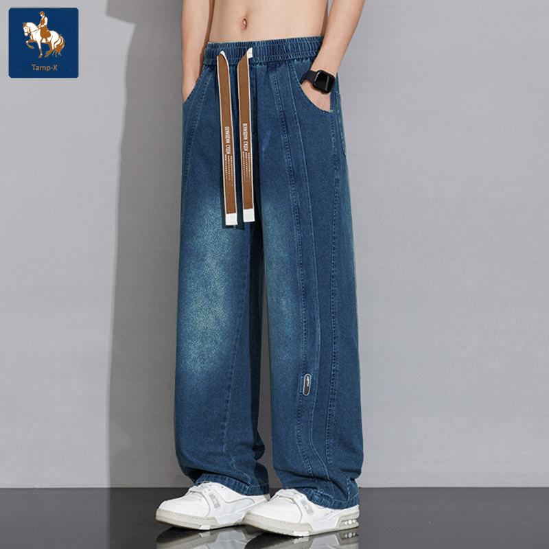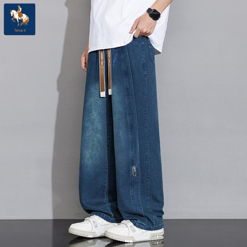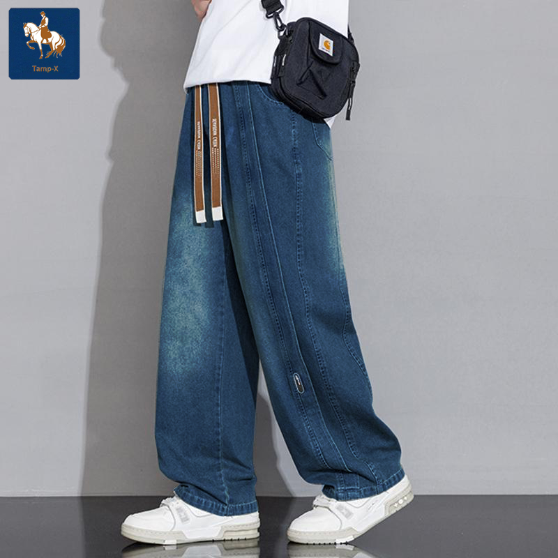 Tamp-X Oversize Celana Jeans Pria Baggy Denim Santai Korean Style Kulot Straight Pinggang Karet Biru Tua premium