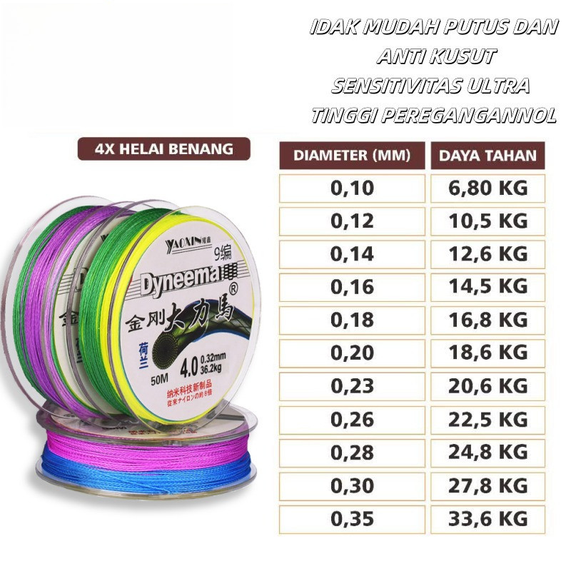 HIUU Tali Pancing 4X 50m Senar Pancing PE Sensor Bright NEO+si 3 Warna Jepang Senar Pancing 4X 50m Super Kuat & Tahan Ba