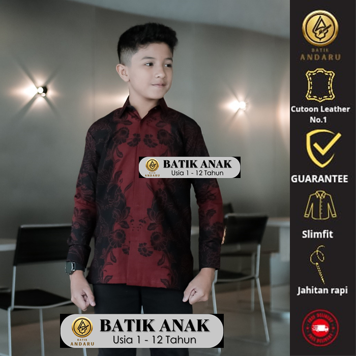 Batik Andaru Kids Motif Hawari Baju Batik Anak Laki Laki Kids Slimfit Lengan Panjang Modern Simpel Bahan Katun Premium Warna Merah Maroon