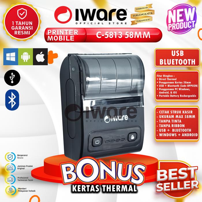 Iware Printer Thermal Kasir 58mm Usb Bluetooth C-5813 Portable Android Windows