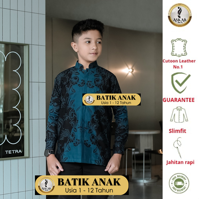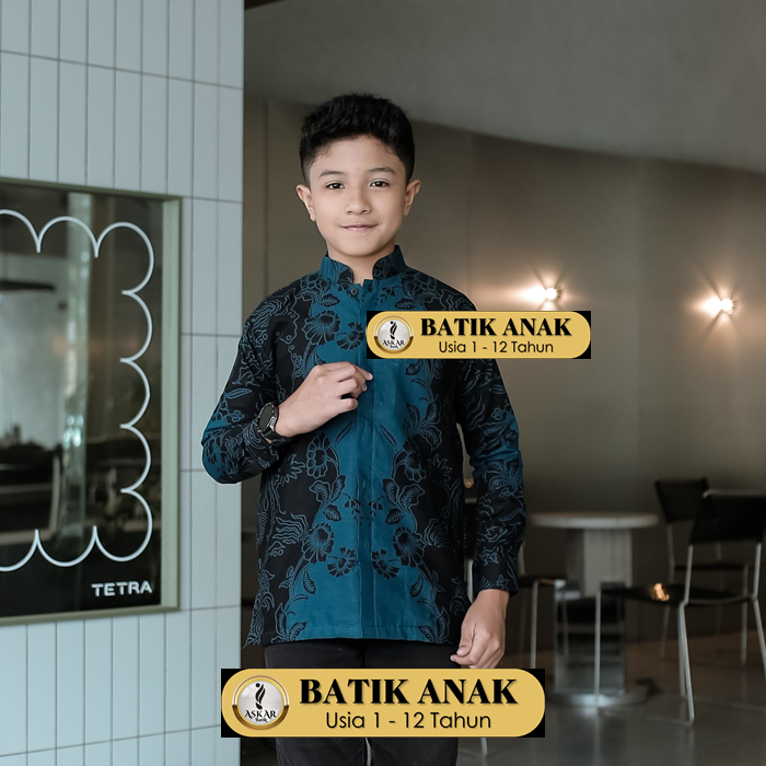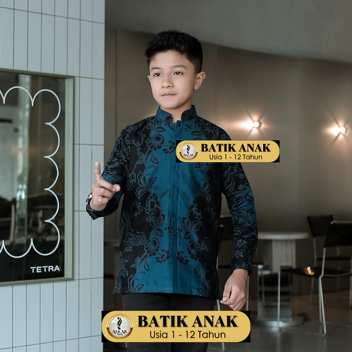 Askar Batik Kids Kemeja Batik Anak Cowok Slim Fit Lengan Panjang Modern Simpel Heem Katun Premium Warna Biru Emirald