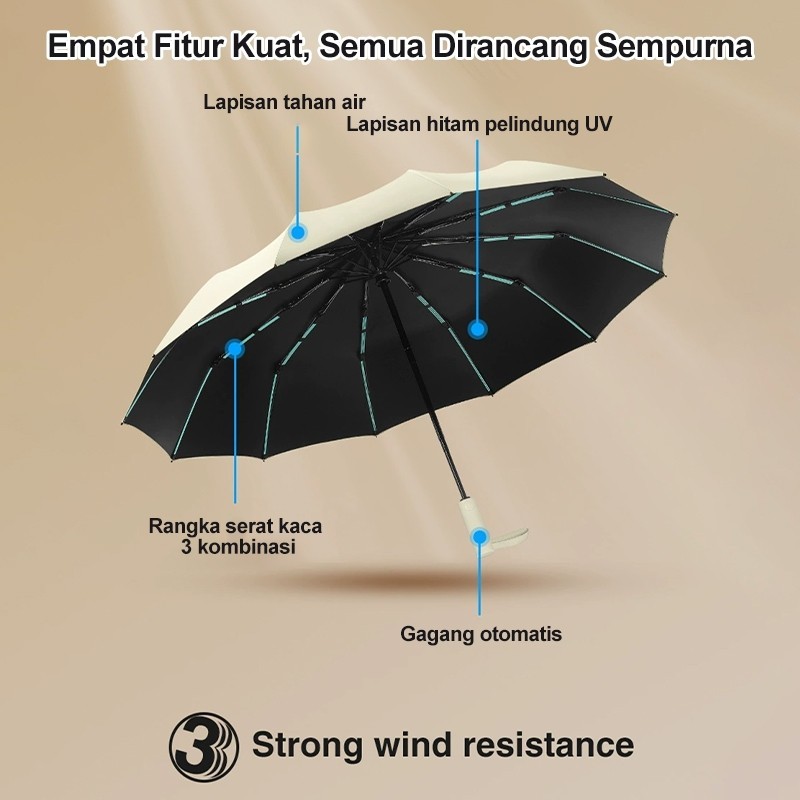 Payung badai otomatis lipat serbaguna hujan & panas, rangka tebal dan kokoh, payung premium pria & wanita tahan hujan sekaligus melindungi dari sinar matahari