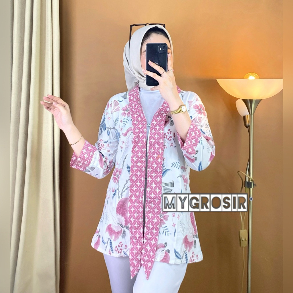 Blouse Batik Wanita Lengan Panjang – Atasan Batik Modern Premium Elegan Kekinian Kemeja Kombinasi Motif Aira Pink