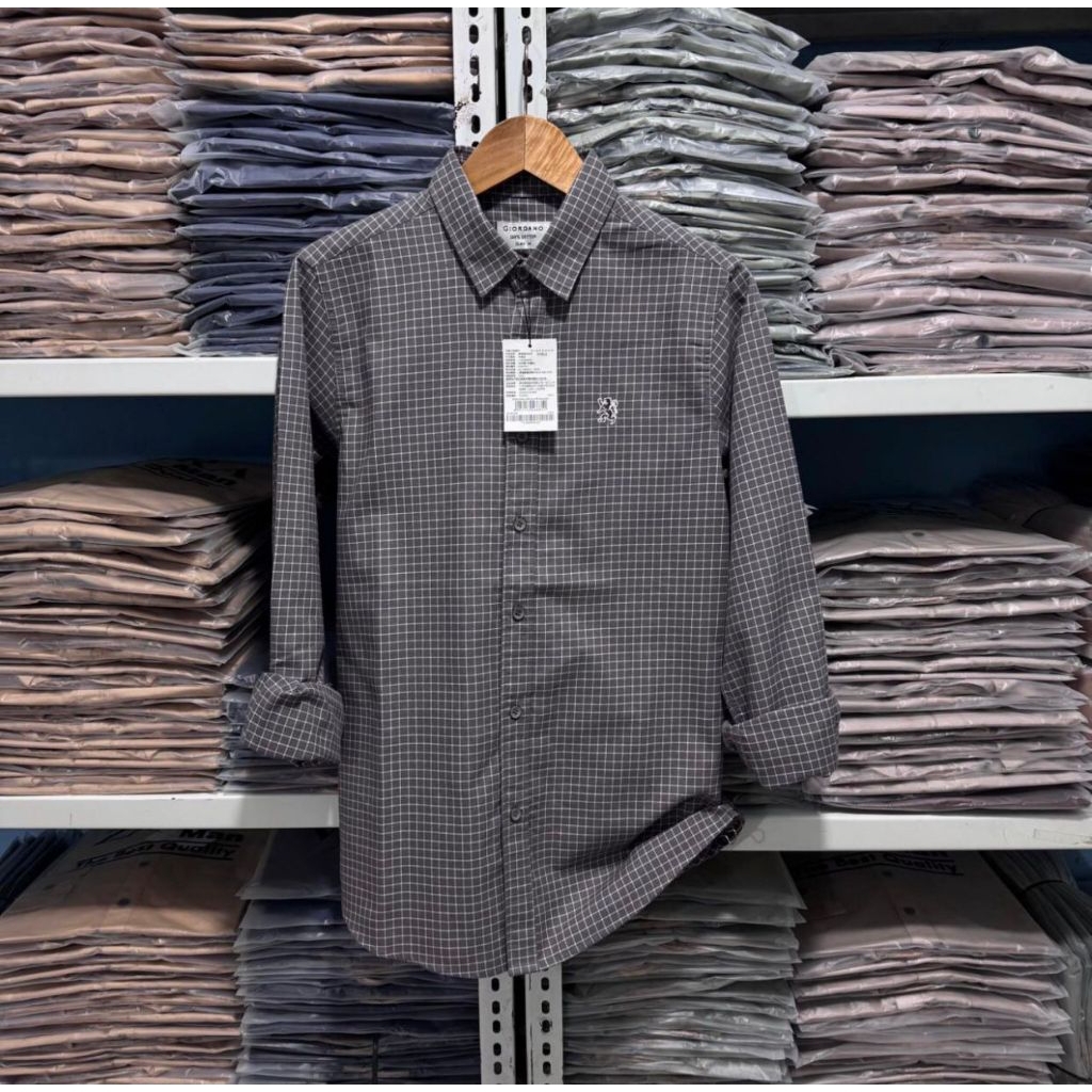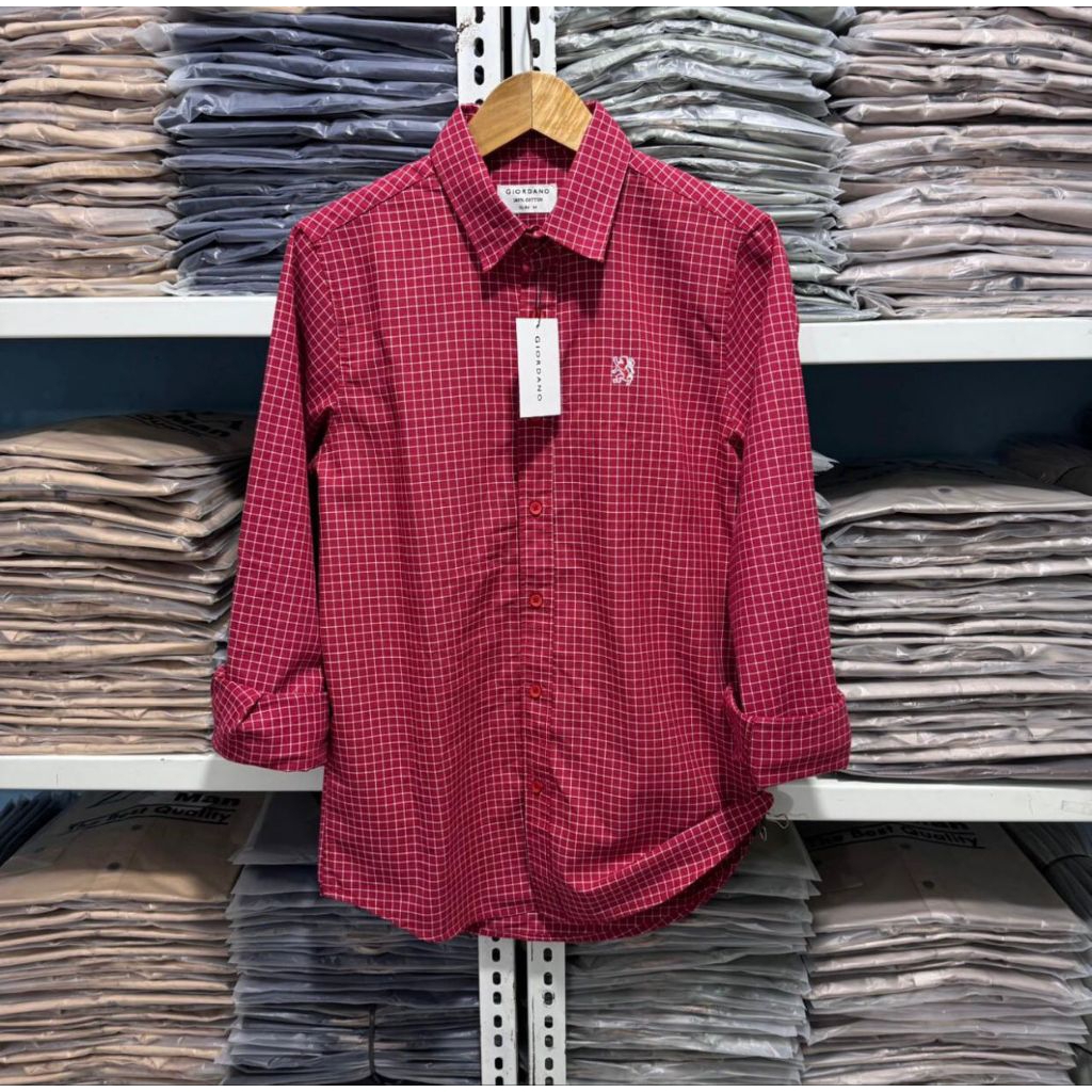 kemeja kotak kotak Giordano lengan panjang slim fit logo bordir 3D casual material Oxford