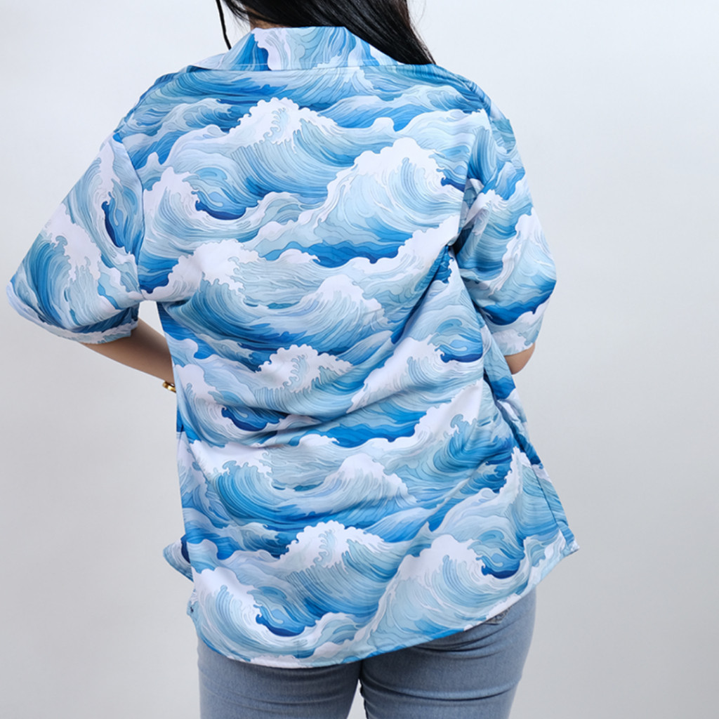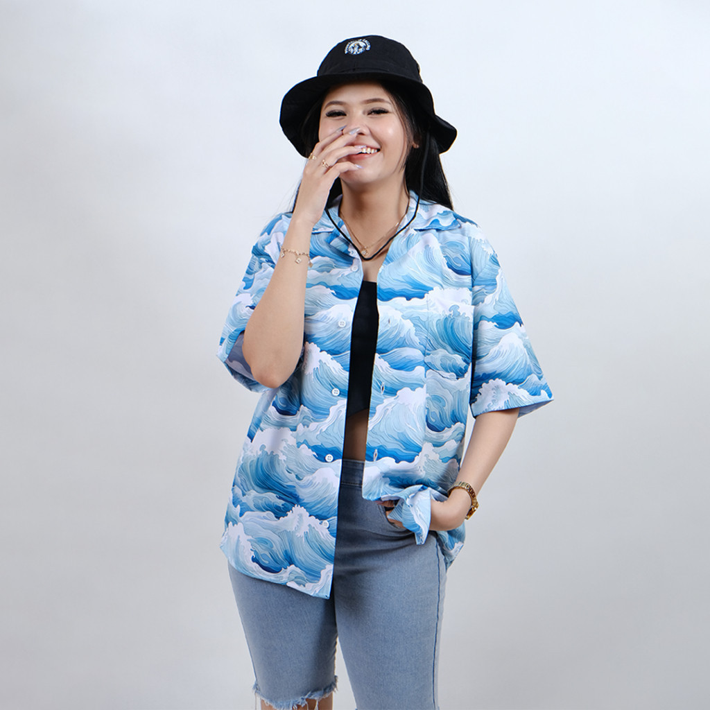 GOKS Baju Kemeja Pria Wanita Motif Pantai Hawai Dowear Lengan Pendek Premium OMBAK HIJAU 169