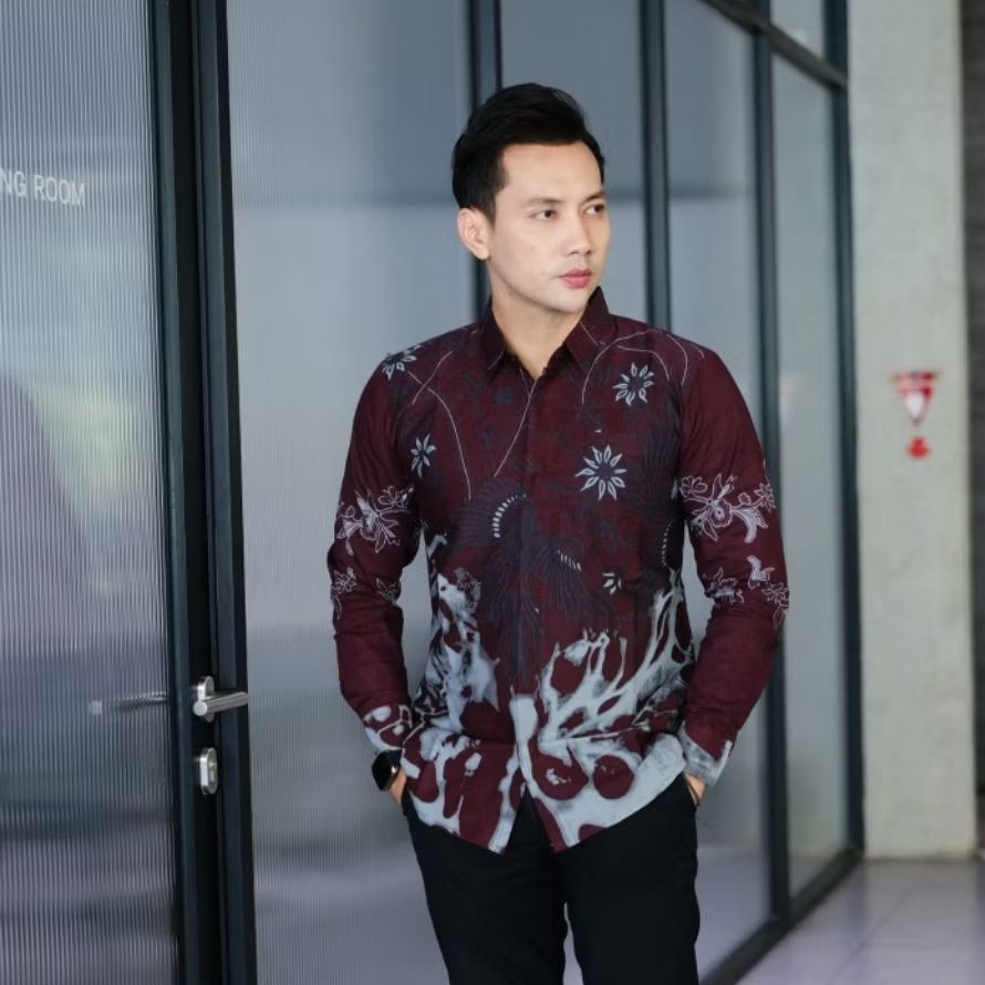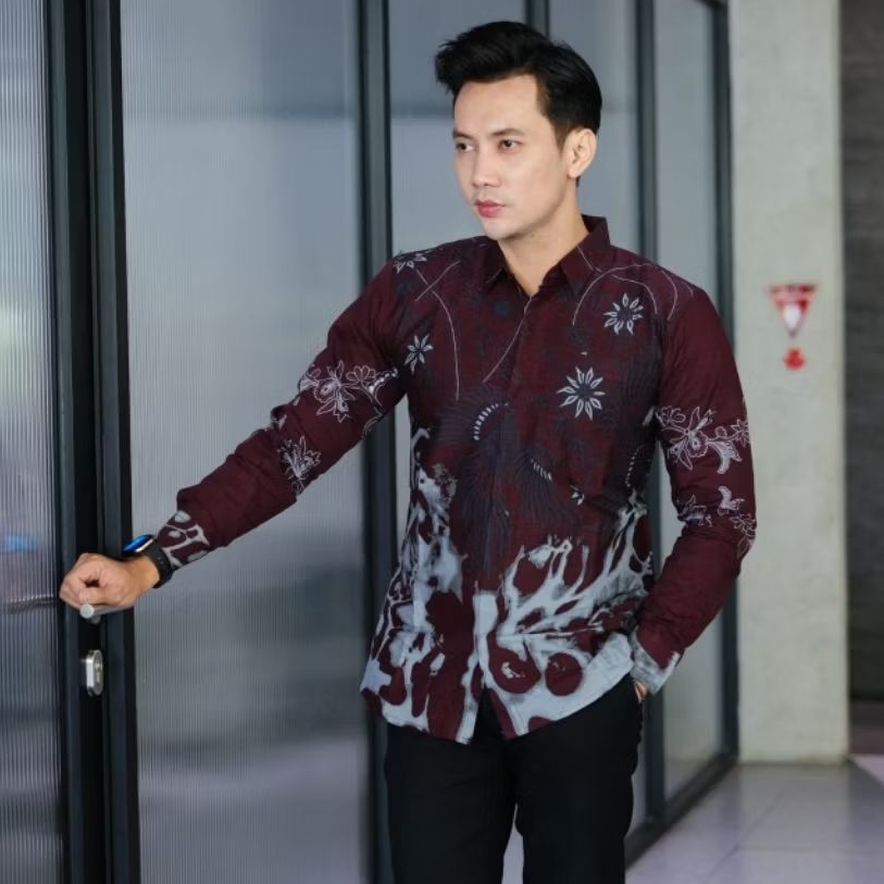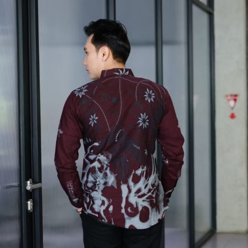 Warna Bergundi Kemeja Batik Pria Modern Original Slimfit Lapis Furing Bahan Katun Prima Motif 021 Baju Batik Pria Lengan Panjang jumbo