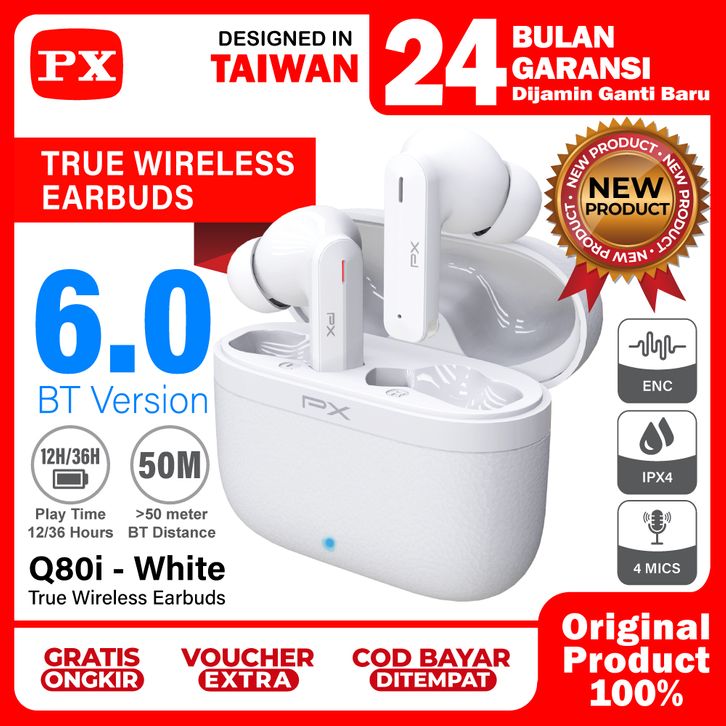 Headset TWS Earphone Bluetooth 6.0 Earbuds Headphone True Wireless ENC 4 Mics IPX4 PX Q80i - White