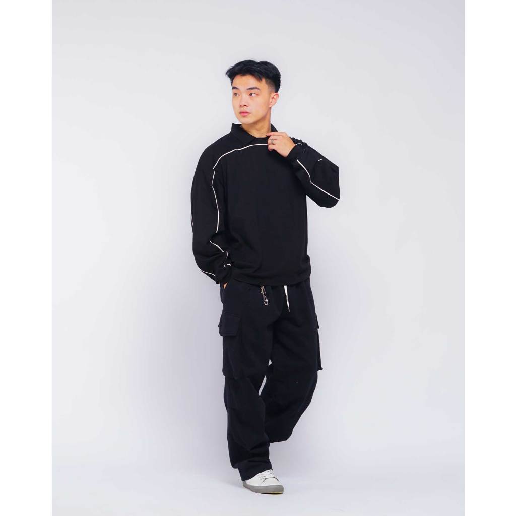 Boxy Piped Polo Long Sleeve - Polo Lengan Panjang Boxy Berlis Abyad Apparel Pro Project