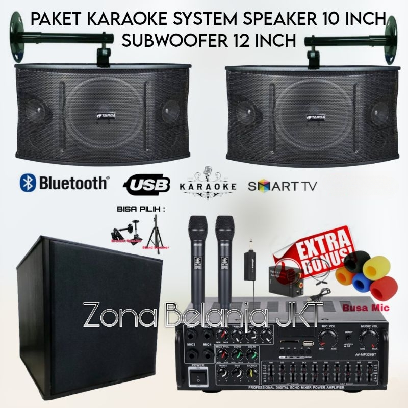 PAKET KARAOKE SOUND SYSTEM INDOOR OUTDOOR SPEAKER TARGA 10 INCH + SUBWOOFER 12 INCH AMPLIFIER USB BLUETOOTH MURAH BERKUA