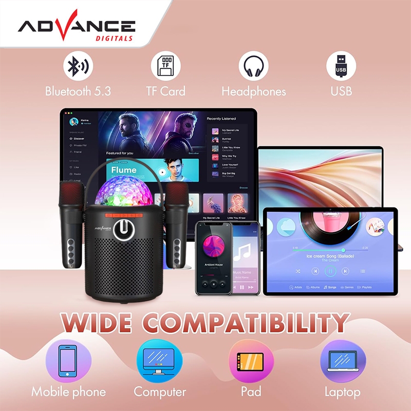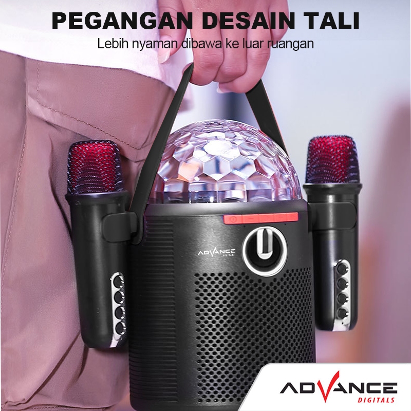 Advance speaker karaoke mini V8 speaker bluetooth speaker karaoke double mic sepeker aktif bluetooth karoke speaker bluetooth portable dengan lampu disko Garansi resmi 1 tahun