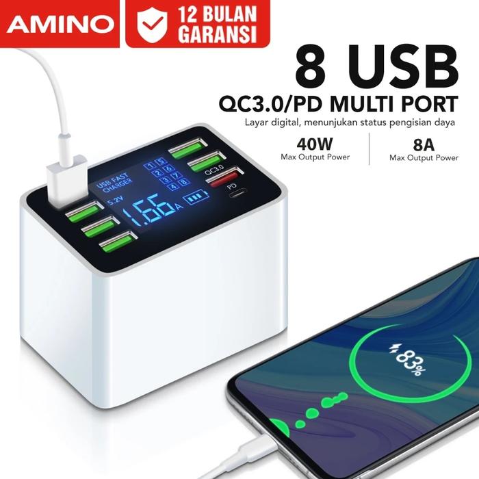 AMINO 8 USB Port Multi Port Charger QC 3.0/PD Fast Charging LED Function 40W Putih - Putih 8 USB Port
