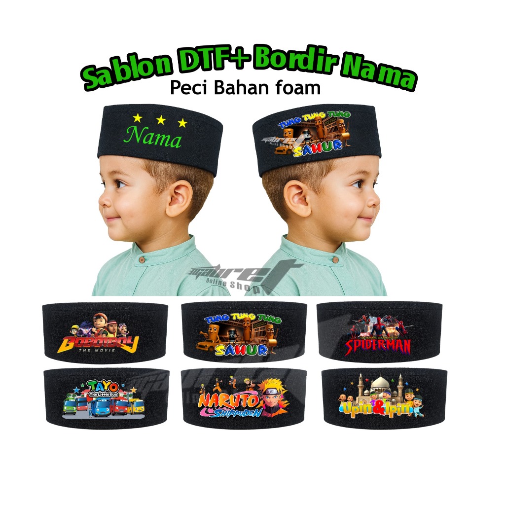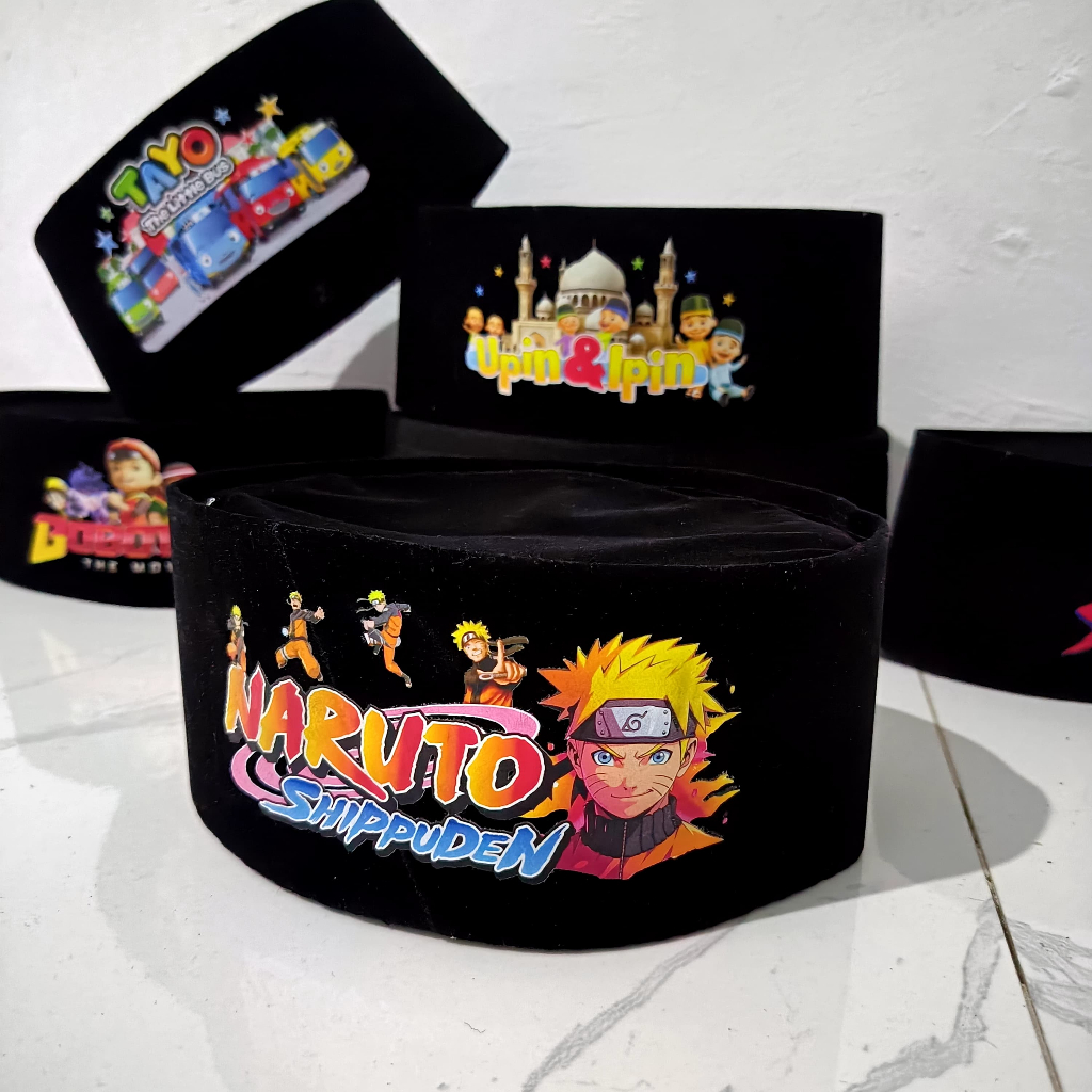 Kopiah Anak Karakter Tung Tung Tung Sahur Upin Ipin Spiderman Tayo Anomali Naruto Bordir Nama - Peci Anak Muslim - Songk