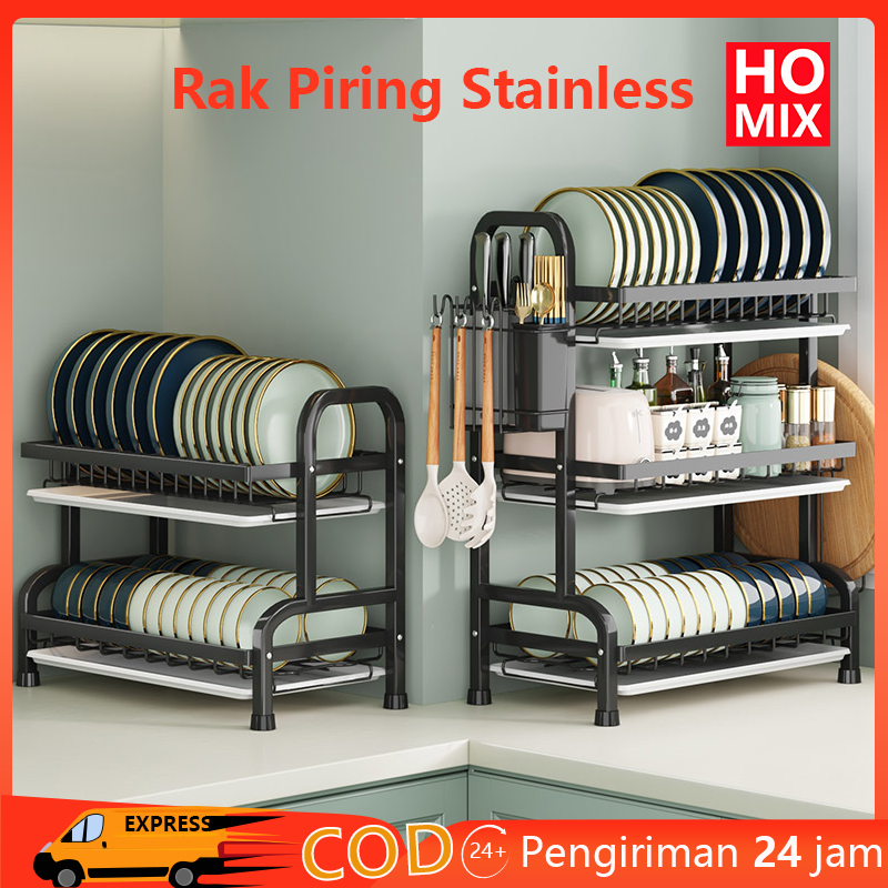 HOMIX Rak Piring Wastafel Stainless Rak Dapur Piring Dengan Aksesoris 2 Susun Tingkat Peralatan
