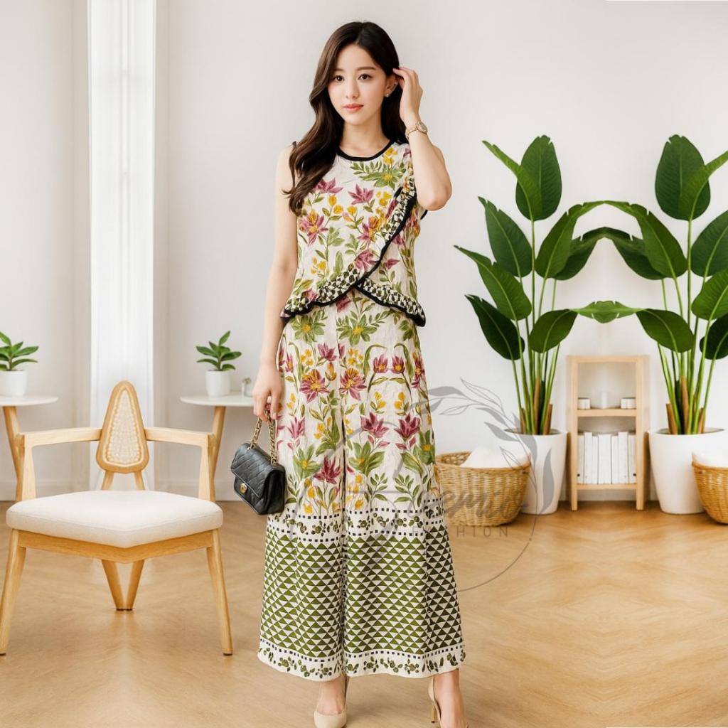 Set Lulay Setelan Twiscone Atasan Tanpa Lengan Dan Celana Panjang Wanita Casual Motif Floral