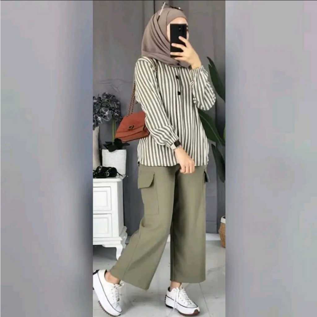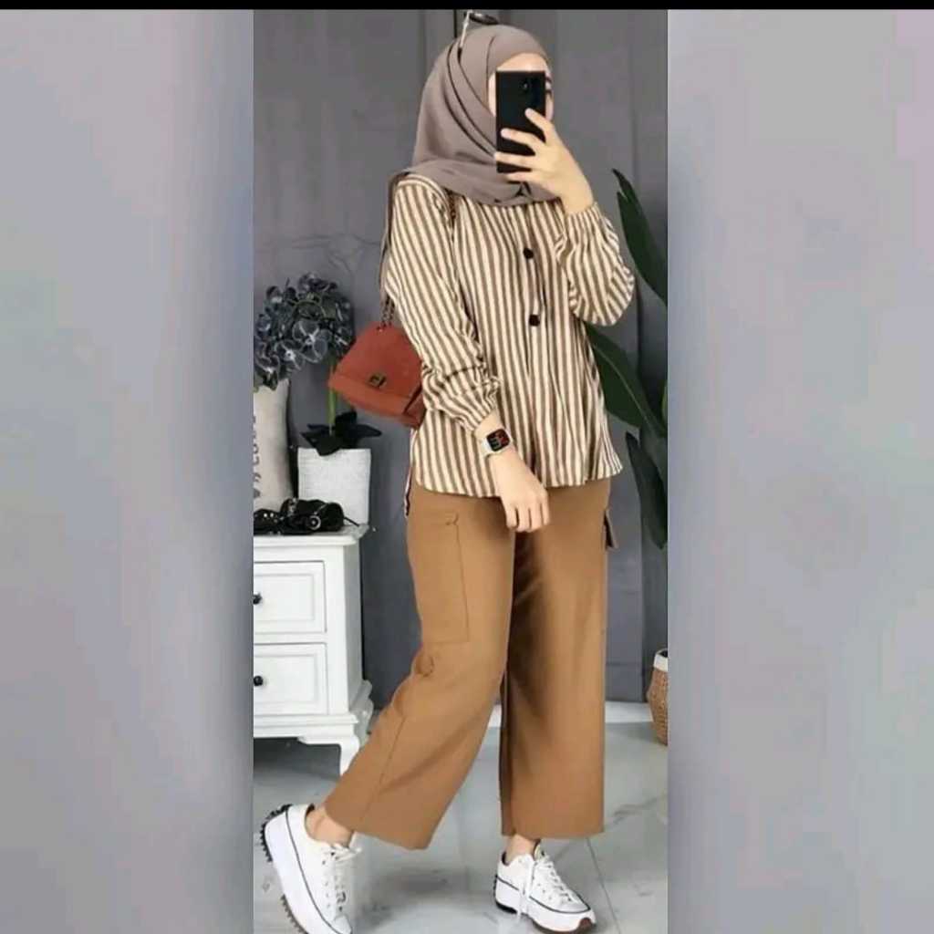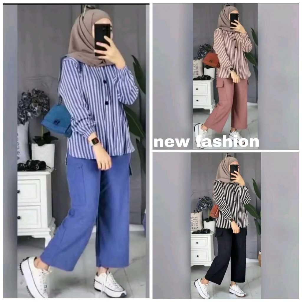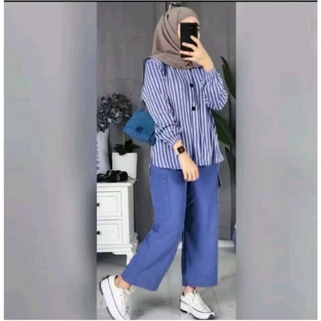 ONESET RAMOSA Setelan Kemeja Wanita is – Baju Atasan Salur Lengan Panjang + Celana Panjang Stylish, Outfit ian yang Nyam