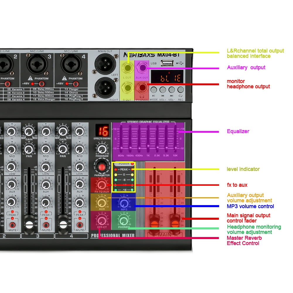 NEW BAXS [Asli] MX04BT mixer profesional 4-channel built-in EQ 16DSP Bluetooth/USB/PC/MP3 playback modeEQ/alat perekam b