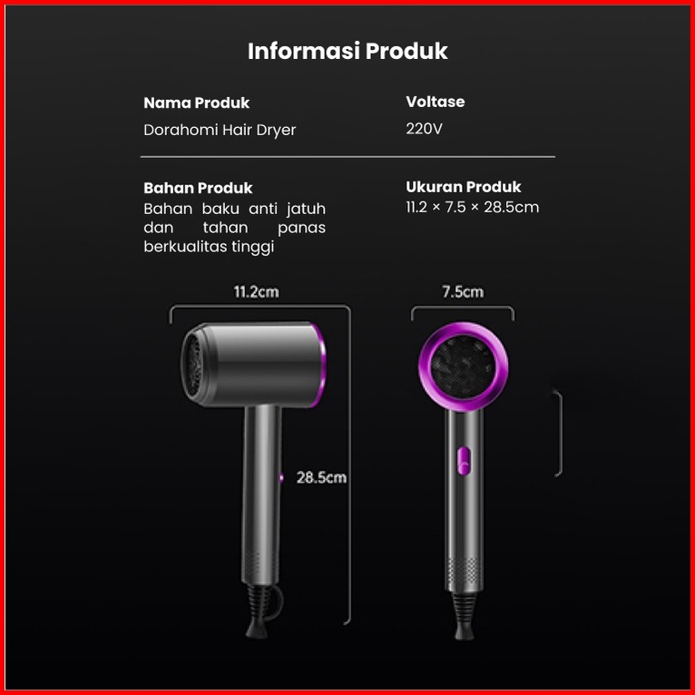 Dorahomi Hair Dryer 800w Professional Perawatan Salon Alat Pengering Rambut Mini Hair Dryer Low Watt Mini Hair Dryer Ion