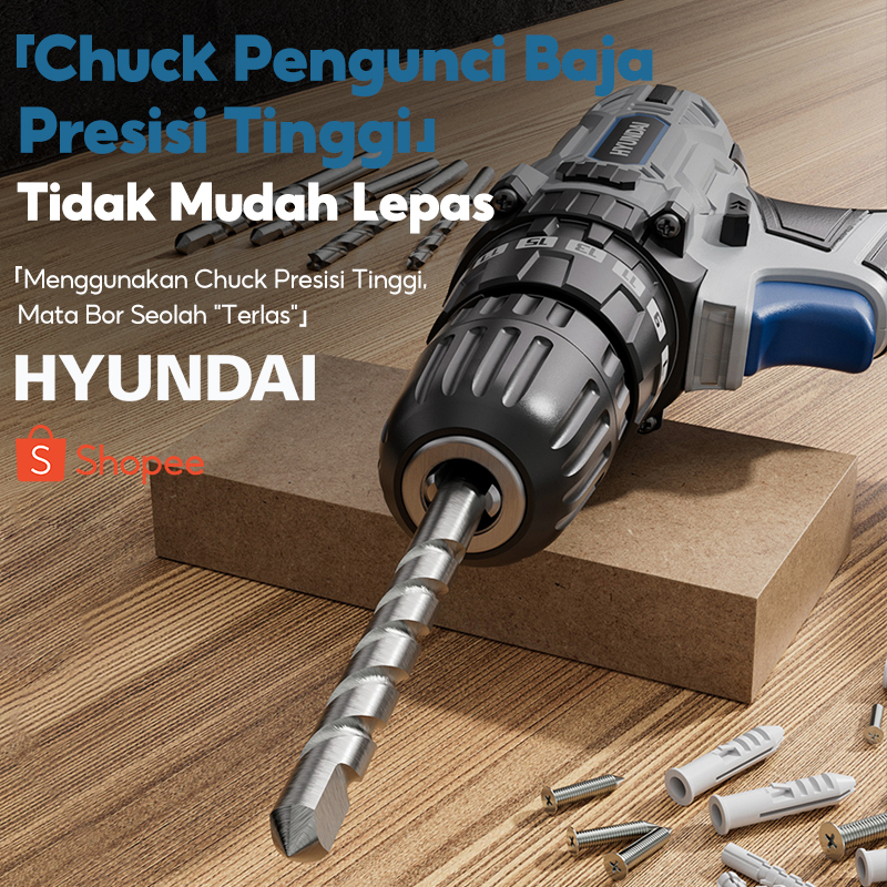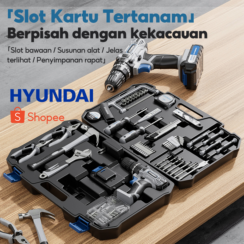HYUNDAI Mesin Bor Listrik Set Lengkap Baterai Cordless Alat Tukang Tool Kit Tang Obeng Palu Kunci Pas Pita Pengukur