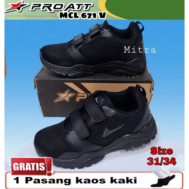 PRO ATT LST Sepatu Sekolah Anak Kecil Tanggung Cowok Cewek Hitam Tempel Perekat Original Murah Free Kaos Kaki - Size 30 sd 38