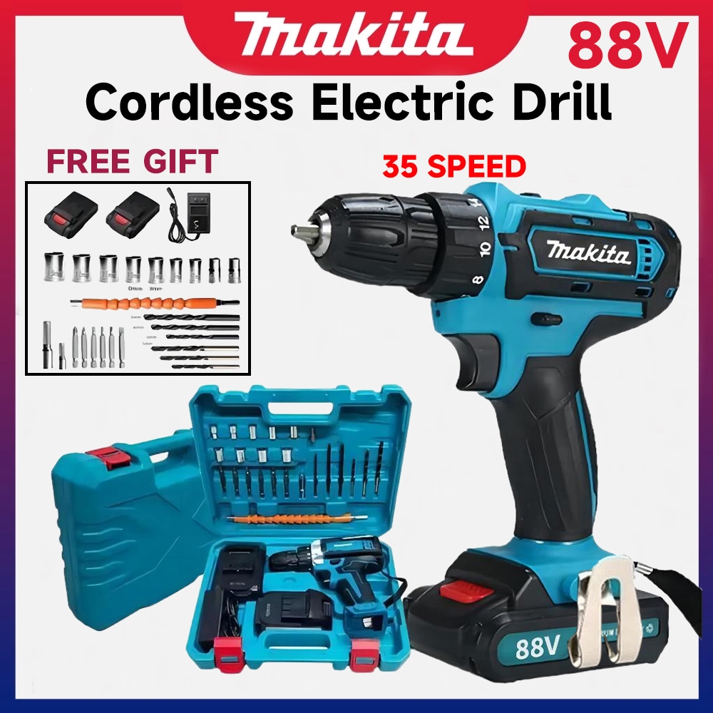 MAKlTA 88V Mesin bor 2baterai cas 10mm bor listrik murah bor tangan baterai besi tembok Beton kayu Cordless Drill bor ca