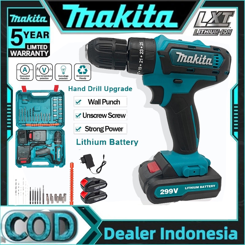 MAKlTA Mesin bor 2baterai 299V cas 10mm bor listrik murah bor tangan baterai besi tembok Beton kayu Cordless Drill bor