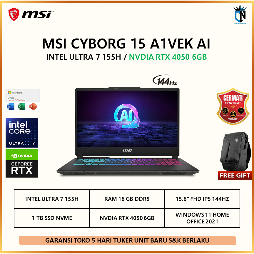 Laptop MSI CYBORG 15 A1VEK AI ULTRA 7 155H RTX4050 6GB/ 16GB 1TBSSD W11 OHS 15.6FHD 144HZ