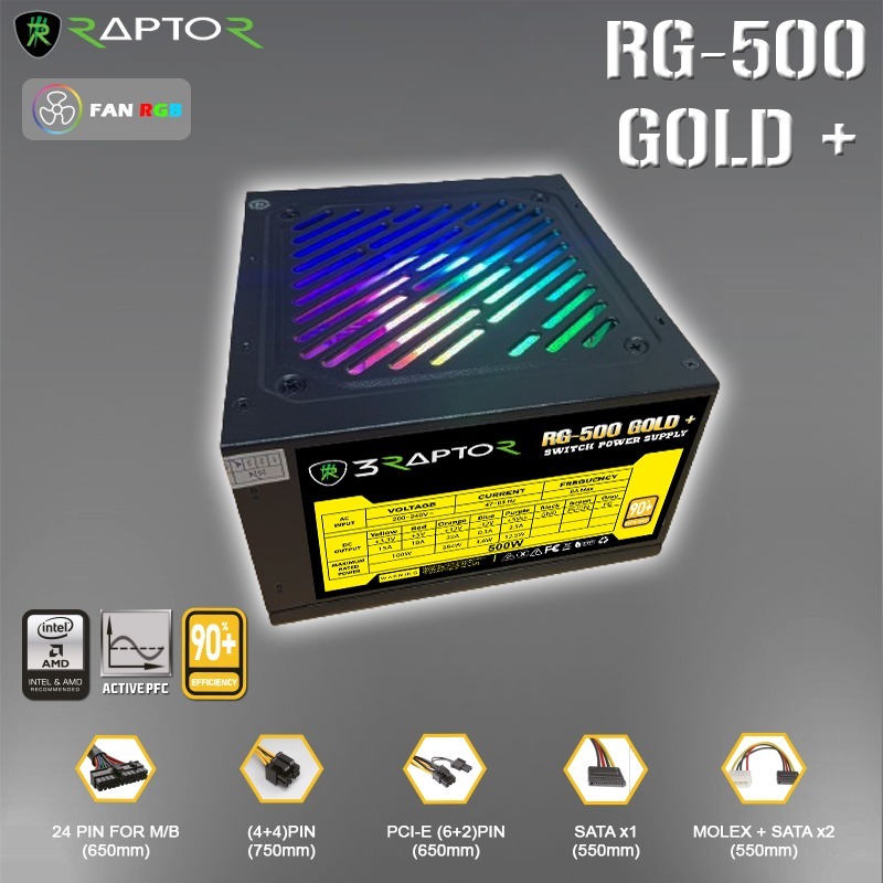 [Star] Power Supply Psu Gaming 3 Raptor Rg-500 Gold+ 500 Watt Fan Rgb Psu Pure Power Supply Flat Cables
