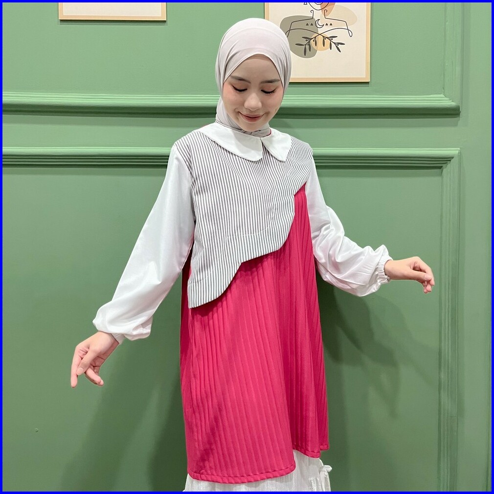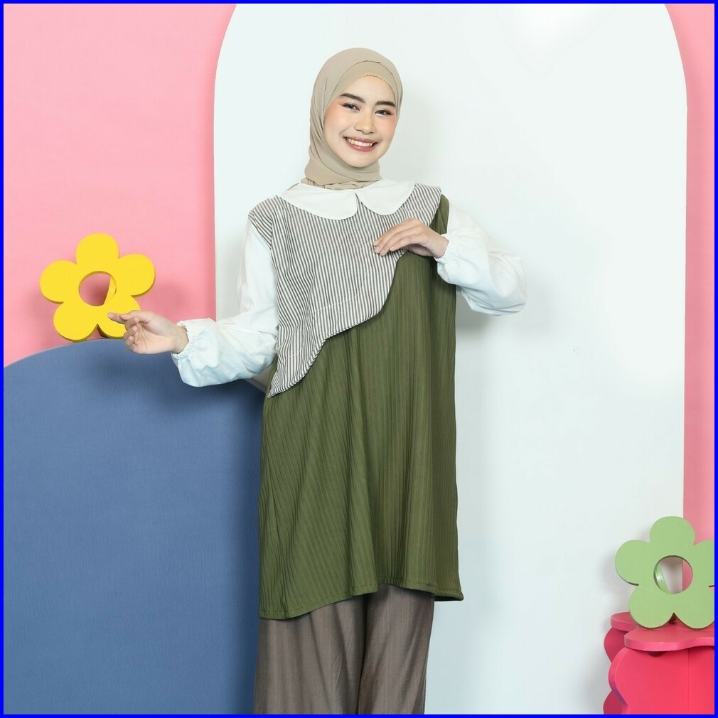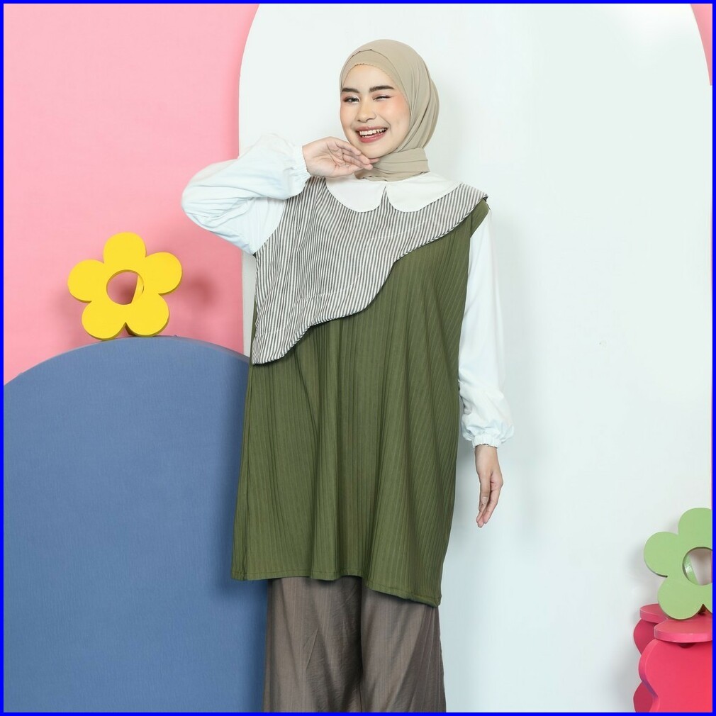 Mybamus Callope Tunik Knit Kombinasi Stripe Tunic Salur Kekinian Wanita Casual